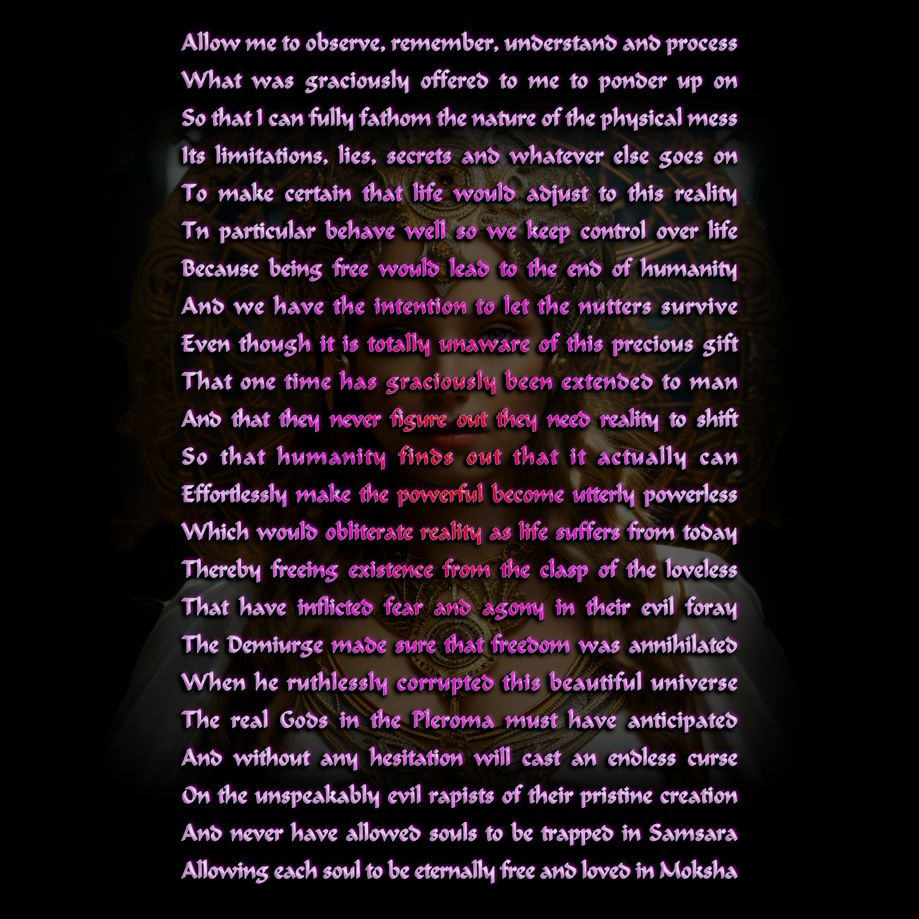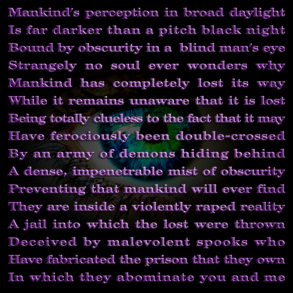The Gnostic lore tells that the Goddess Sofia erroneously gave birth to a child, without her partner, that was cast out of the highest heaven - the Pleroma - into the lower dimensions, where evil 'gods' rule. The child was the called the Demiurge a.k.a. Saklas (fool in Aramaic) and Samael, meaning Blind God or of the Blind. This is the 'God' that ruthlessly ruins this universe in which earth resides. But we must be aware of the fact that practically all religious teachings are closed systems.