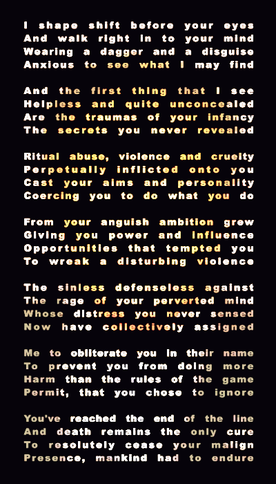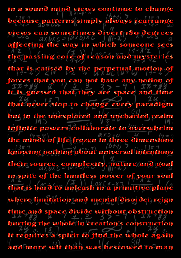 I wrote this prose somewhere around 2010, out of the blue, which is the best source to obtain creative ideas. My pen name in poetry sites in long gone days used to be Rage of Reason.