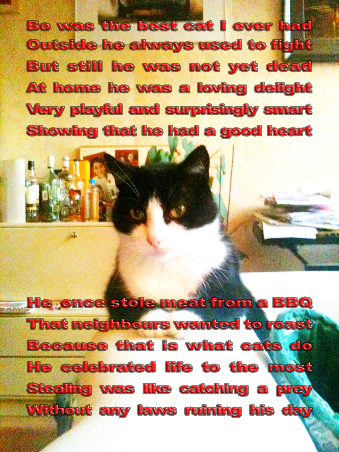 In the middle of the night he jumped on my chest and I saw two golden eyes, as if he wanted to protect me. He passed away at 16.5 years, making me cry my heart out. I still miss him.