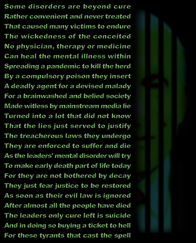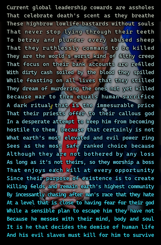 This world is in a horrific turmoil because the most criminally insane have seats in leadership offices. They care only for their own image, money and power and whomever has to be killed to reach their goal, is on the way to other dimensions.