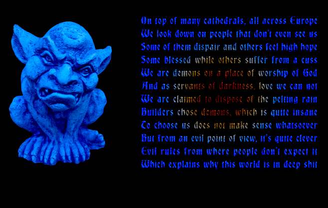Demon statues commonly placed on cathedral roof tops, looking down unnoticed on believers and disbelievers from above. Why would clergy place statues of demons on top of their buildings of worship? Is that a logical thing to do for assumed followers of God? And who would such a God be like then? And what about the the clergymen - what does that make of religious leaders? Just asking.
