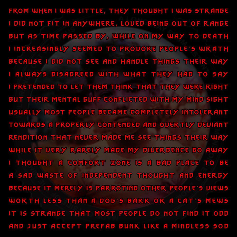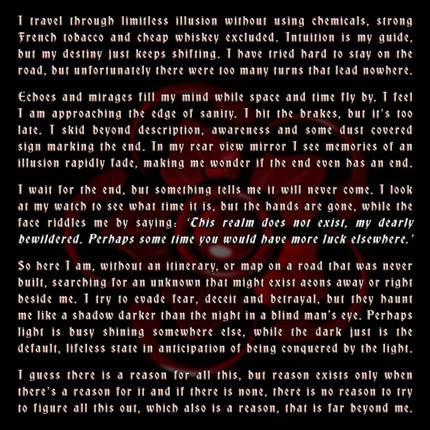 From a very young age my life turned into a lasting conflict with the illusion riddled physical dimension. I was much unlike other children; walked alone in the rain forest, played with indigenous children, drew a horse with a long reproductive organ, which got me punished. I rarely spent time at home, always outdoors looking for what life was going to present me. It got worse when I grew older which lead me to aspects of life that most people would never see. My memory is overflowing with strange experiences and odd views. I regret my stupidities, while cherishing thoughts that help me to progress my strange existence.
