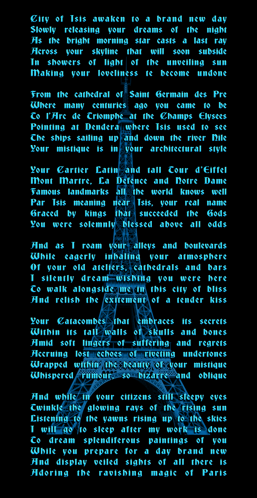 Visual poems and prose have multiple shapes - portrait, landscape or other forms, which is why it is difficult to place them in a standard structure. Preferably, this page should be watched on a desktop monitor to benefit from the poems' physical size. I've written a ton of poetry over the decades; below you find a small selection, with the exception of poetry that is too piercing to publish, particularly in these days of unveiled censorship. Click on images to view them in a lightbox. Scroll or click to return to the page that contains the poetry viewed.
