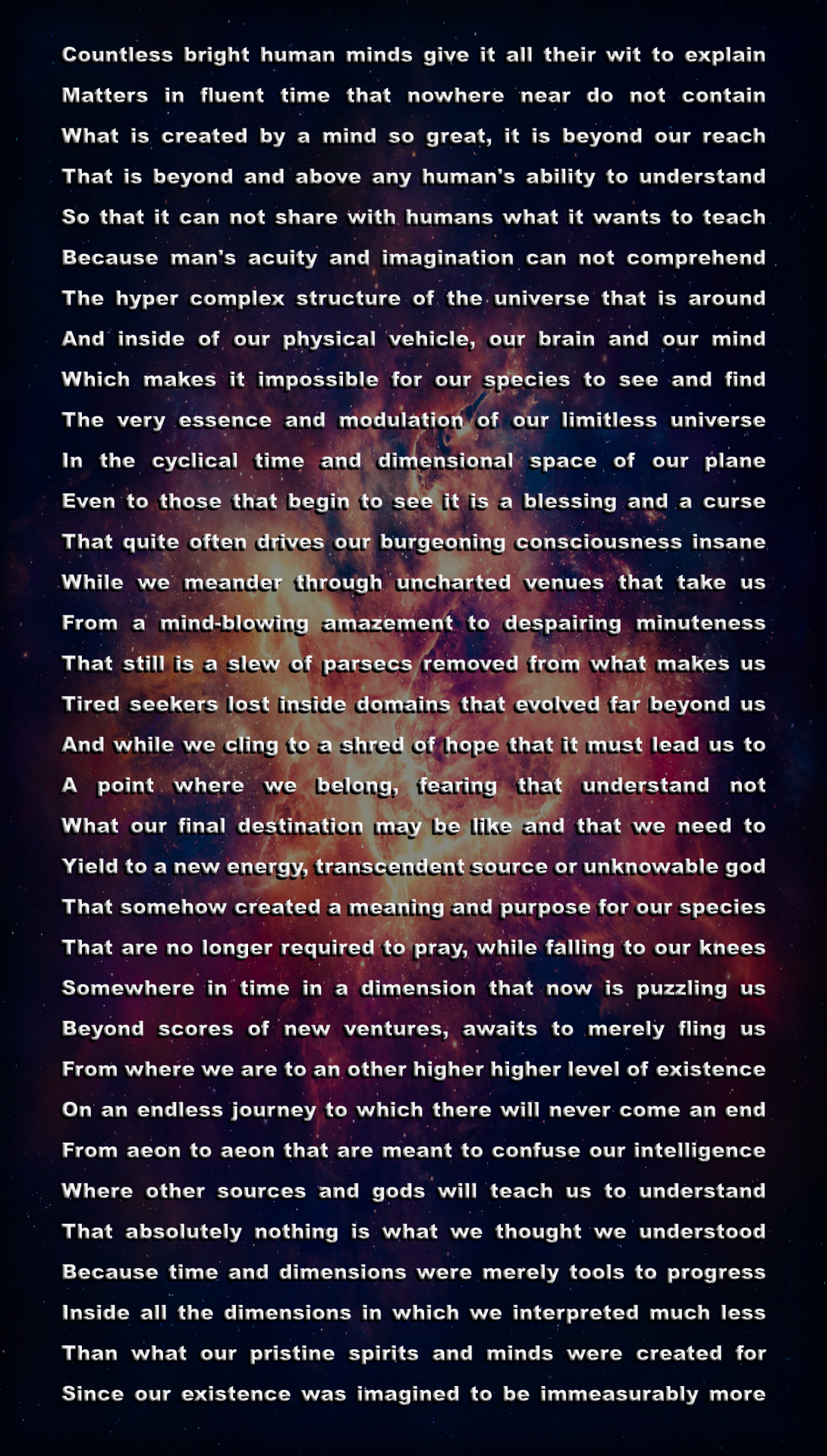 Mankind is a tiny dot within a minute dimension inside of a vastness beyond measure, whose greatest talent is to love and care, even though they lie and kill.