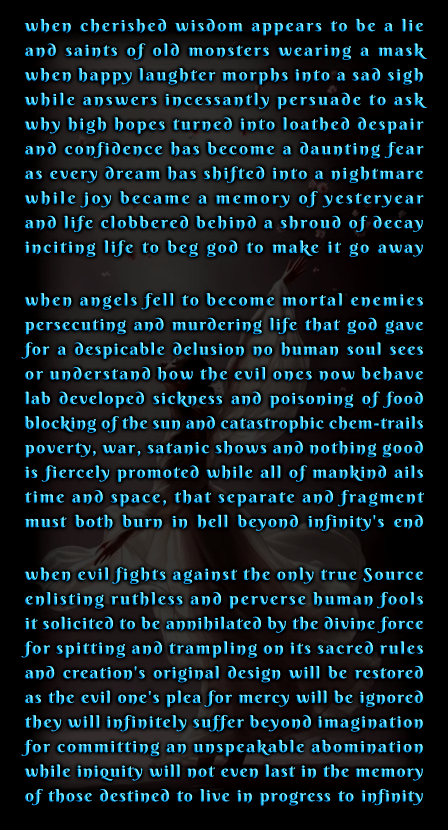 It is not if but when evil rule will be obliterated by any means necessary to annihilate iniquitous forces to make sure they'll never return to continue nefarious work. it is difficult to imagine that the celestial sanitising will take place without a deluge of suffering, but the war in the heavens must one time descend to planet earth.