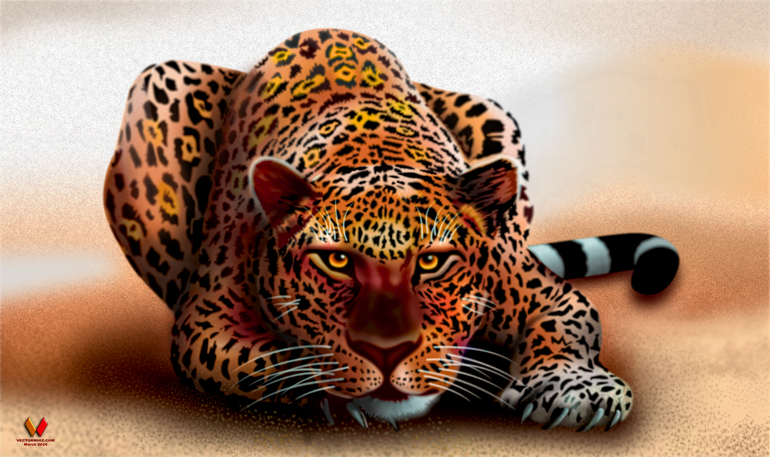 Vector image of a crouching jaguar created in Affinity Designer - reference to a recurrent dream in which a big cat approached me. I feared it was going to kill me, but it just sniffed at me, left and returned several times to sniff at me again. A shaman told me, it was a spirit appearing as a jaguar, that wanted to know what obstructed me, after an ayahuasca trip.