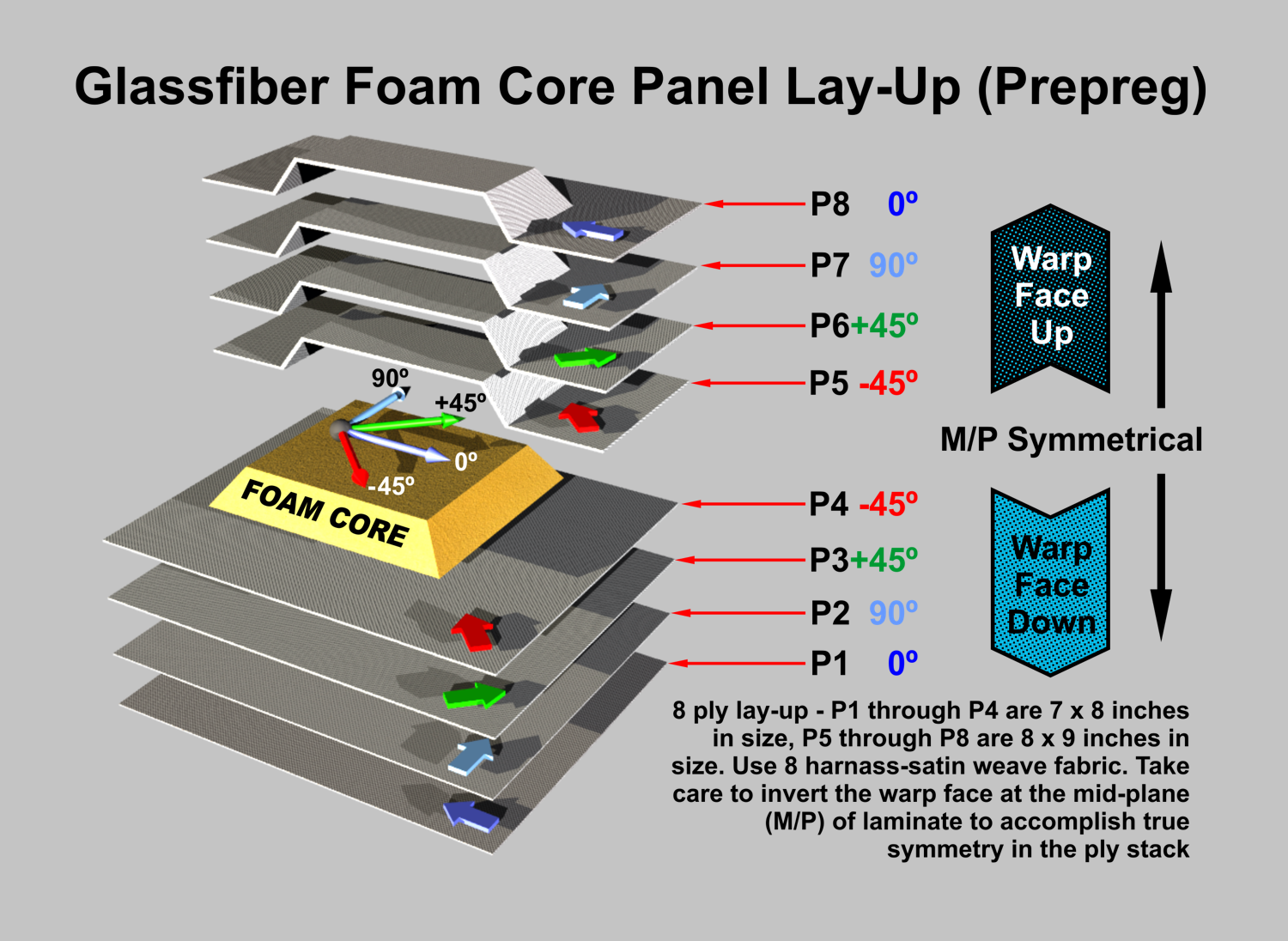 Drawing of a Foam Core Panel Lay-Up scheme, indicating the weave directions included in an educational book of advanced Composites manual. The drawing was created in Rhinoceros 3D version 5 and the text is edited in Affinity Designer.
