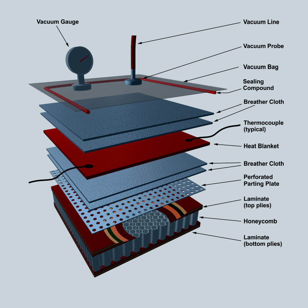Image showing the layers to be used in vacuum set up of a honeycomb panel. Drawn in Rhinoceros 3D version 5 and edited in Affinity Designer. This image is part of a course session and used in a book.